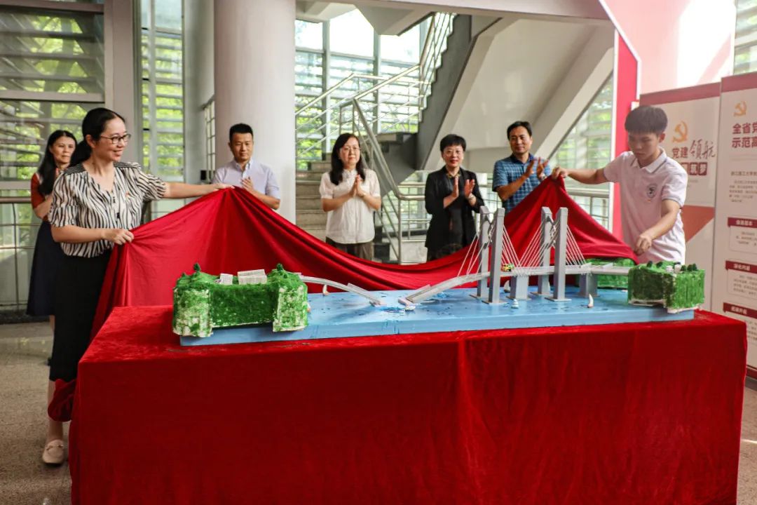 师生党员结合专业特色,进一步深化“捧在手心的红色模型”党建育人品牌,制作了“新中国标志性建筑”系列红色模型,展现大国崛起的蓬勃力量。韩晶晶和学生代表共同为“港珠澳大桥”主模型揭幕。红色模型制作团队学生代表王嘉琪分享心得,这一个个模型凝聚着他们对祖国的深情厚意和赤诚担当。