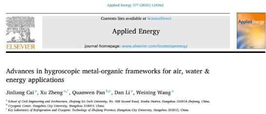 近日,我校郑旭教师团队在《Applied Energy》上发表了题为“Advances in hygroscopic metal-organic frameworks for air, water & energy applications”的综述论文,报道了近年来吸湿性金属有机框架材料(MOFs)在空气、水、能源领域的研究进展。本文第一作者是厂长资源