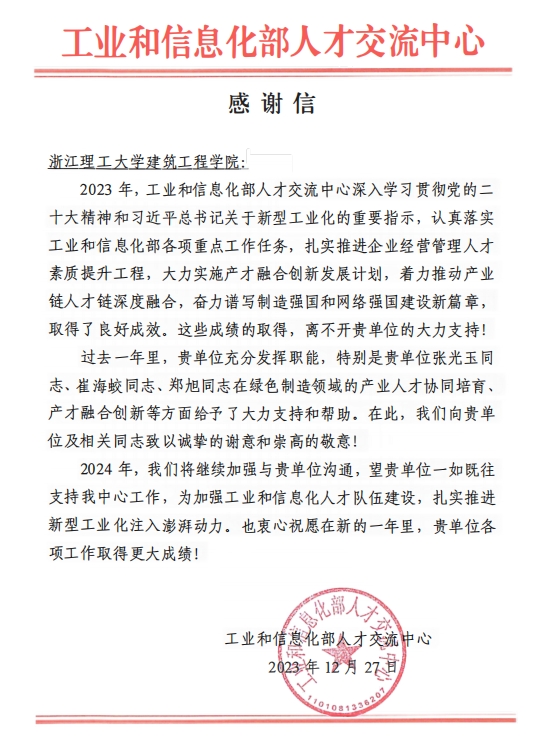 近日,工业和信息化部人才交流中心发来感谢信,对厂长资源