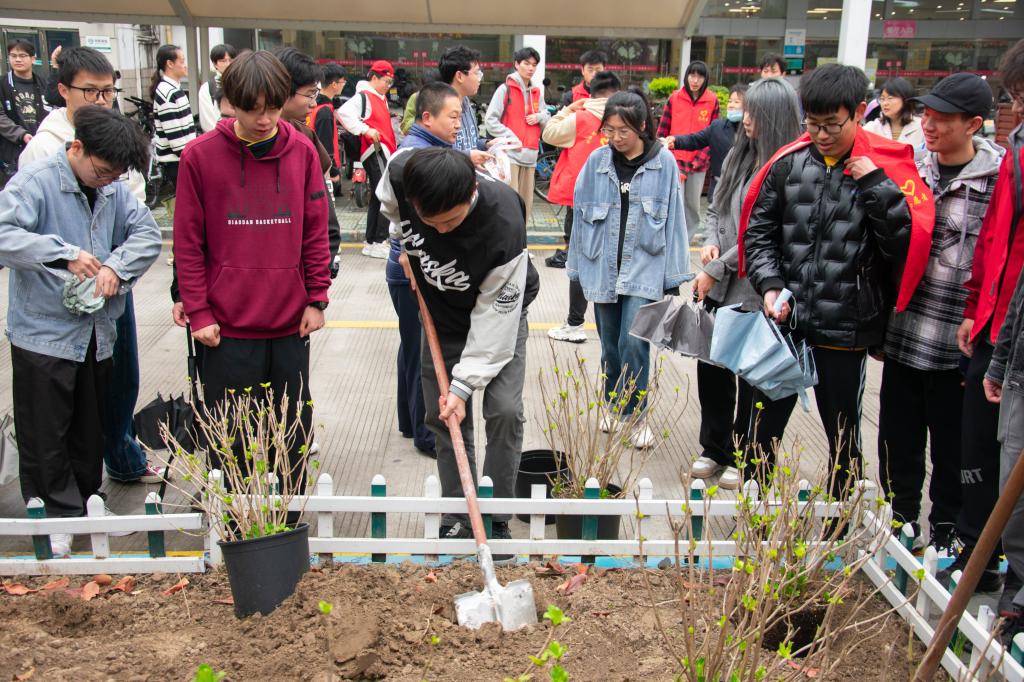 同学们一边栽树、浇水,一边倾听杨王虎等老师们讲述不同树种所蕴含的思政小故事,在劳动的过程中厚植理想信念。