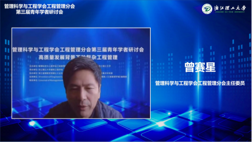 曾赛星在致辞中对管理科学与工程学会工程管理分会发展情况进行介绍,对我校承办本次会议表示感谢。曾赛星教授表示,在迈入高质量发展的时代背景下,工程管理专业的发展面临着许多现实变化与需求,给学者们提供了研究与思考的空间。本次研讨会为青年学者提供了非常好的信息交流机会,也为大家结交更多朋友、了解学科最新动态提供了平台。最后,他代表学会预祝论坛圆满成功。