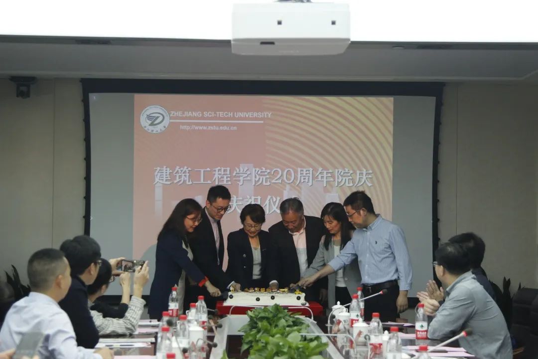 20周年院庆庆祝仪式,姚珺、陈艳、李娜、杨杨、俞峰、金天天共同切开印有“砥砺二十年 建功新时代”字样的大蛋糕,与会人员一起分享建院20年的成果与喜悦。