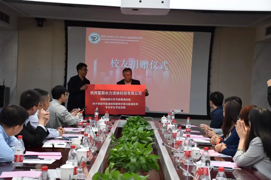 会上,还举行了校友捐赠仪式。02级建环校友郑道夫代表杭州富斯水力流体科技有限公司向母校捐赠价值60万元的校园公共节能暖通设备一组。杨杨代表学院接受捐赠,并向杭州富斯水力流体科技有限公司颁发了捐赠证书。