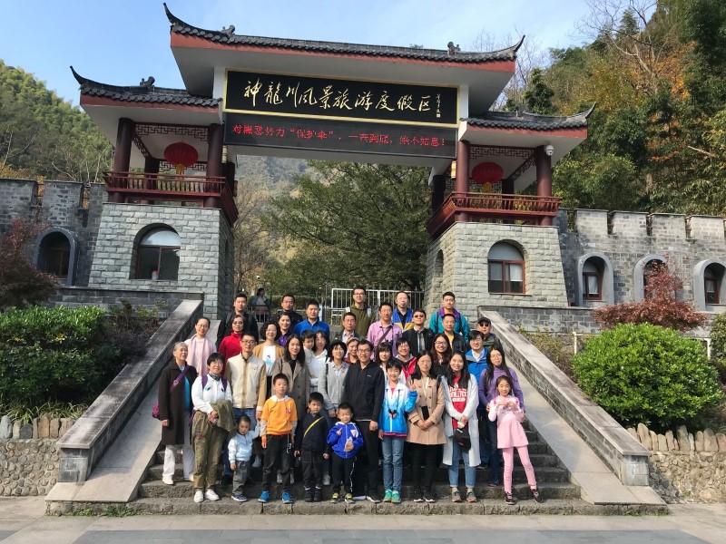 神龙川地处浙江临安市太湖源生态示范区,距离临安市区25公里。景区内集自然风光,休闲度假为一体,植被覆盖率高达98%,空气负氧离子含量是大中城市的300倍,是天然的森林氧吧。景区内分怡乐园、卧龙溪、清凉界、神农台、小华山等五大景点。沿途有巨树、飞瀑、竹林、小溪、山花、悬崖峭壁,还有成片的中草药和黄山松。各位老师在导游的带领下游览了游览含笑轩、神农庙、远志桥、啼莺石、太子榭、鹿含池、神农台等景点。