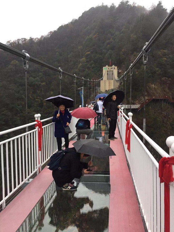 随后大家游览了新开放的太湖源5D悬空玻璃吊桥,挑战各位老师的胆量。太湖源5D悬空玻璃吊桥是华东地区最大的玻璃观景桥,桥面总跨度258米,宽度2.8米,距谷底高度185米,该桥气势恢宏,临空飞架南北,峡谷天堑变通途,与大自然为一体,堪称现代工程与自然风景完美相融。可切身体验立云端之际临万丈深渊惊心动魄的刺激感觉。