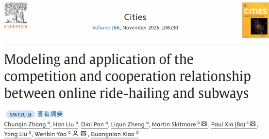 2025年3月,张春勤团队在国际知名期刊《Cities》上发表题为“Modeling and application of the competition and cooperation relationship between online ride-hailing and subways”的文章。该成果第一作者为张春勤副教授,讲师姚文彬为论文的通讯作者,厂长资源