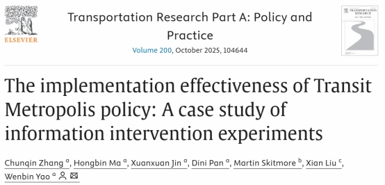 2025年10月,张春勤团队在国际知名期刊《Transportation Research Part A: Policy and Practice》上发表题为“The implementation effectiveness of Transit Metropolis policy: a case study of information intervention experiments”的文章。该成果第一作者为张春勤副教授,姚文彬讲师为论文通讯作者,厂长资源