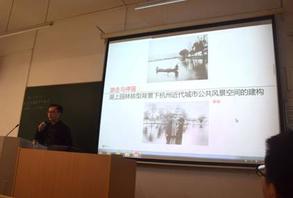 建筑系都铭老师做了“游走与停留:湖上园林转型背景下杭州近代城市公共风景空间的建构”的报告。都老师通过游走与停留的视角下讲解了近代杭州城市公共空间的建构方式,阐述了人与自然空间关系的转变,从西湖景观新旧景观和新旧人群的改变,引出了近代游览方式的变化。