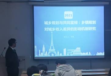 建筑系周强老师做了“城乡规划与共同富裕:乡镇规划对城乡收入差异的影响及机制研究”的报告。周老师论述了新时代背景下共同富裕的意义,运用定量数据分析方法,表明了乡村规划是如何影响城乡收入差异,分析其影响机制,建议同学们通过学习多学科知识来丰富自身。