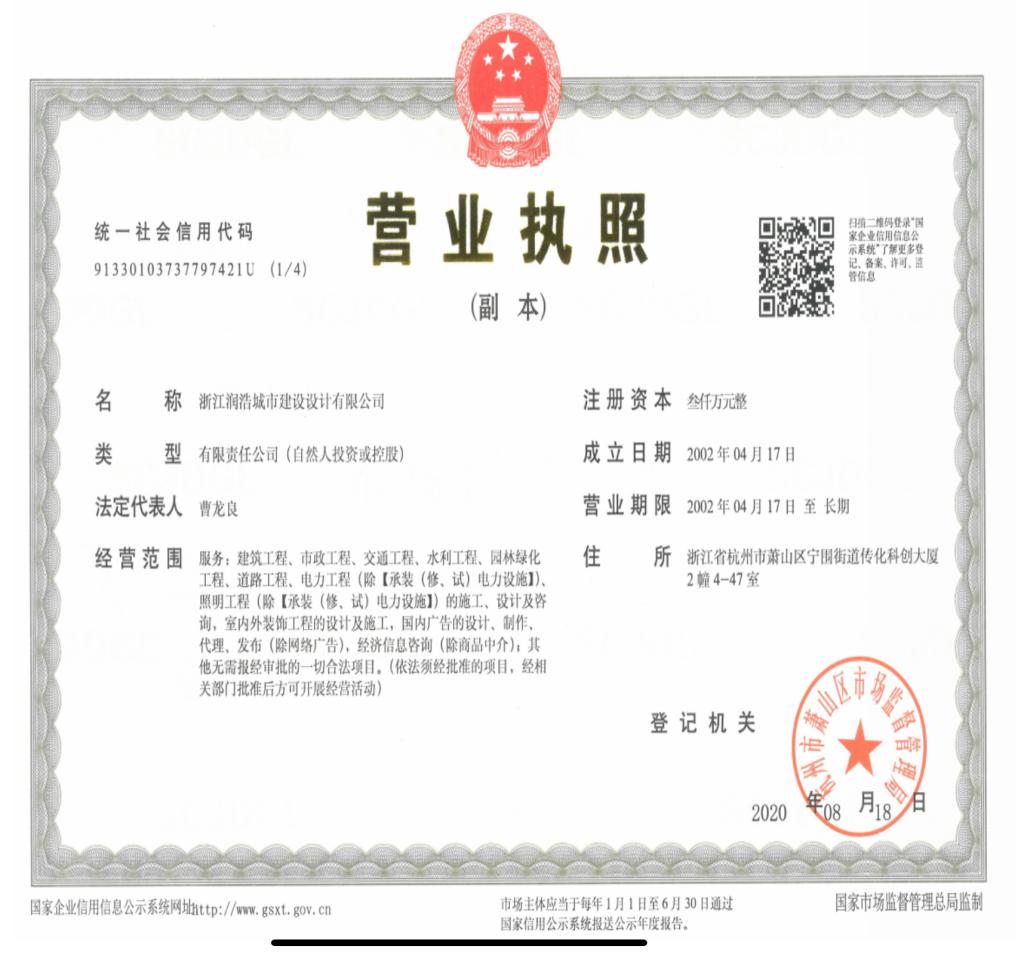 3、资质情况:建筑行业(建筑工程)、市政行业(道路工程、桥梁工程、给水工程、排水工程、公共交通工程),公路行业(公路、交通工程)甲级资质、风景园林甲级资质。